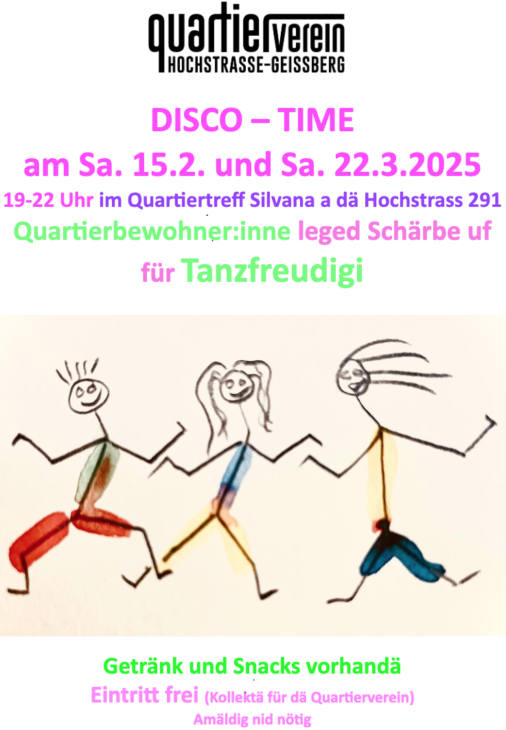 | 28. Februar - 19:00 Uhr | Disco-Time im Quartiertreff Silvana, Hochstrasse 291 ! ABGESAGT ! | |